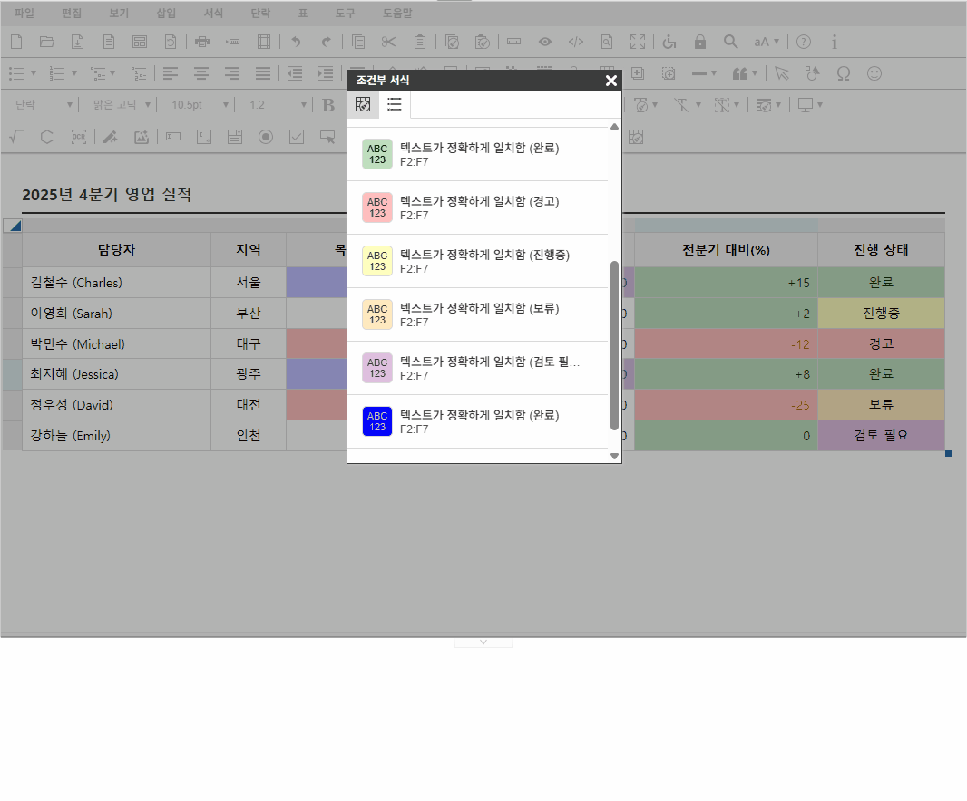 클릭 시 조건부 서식 다이얼로그가 열립니다.