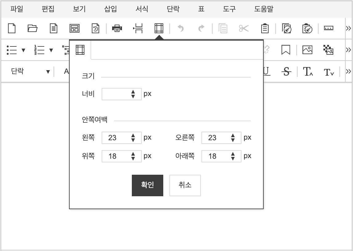 편집 영역의 너비, 안쪽 여백을 설정 할 수 있습니다.