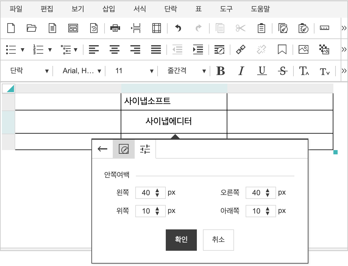 표의 셀, 도형 안쪽 여백을 설정 할 수 있습니다.