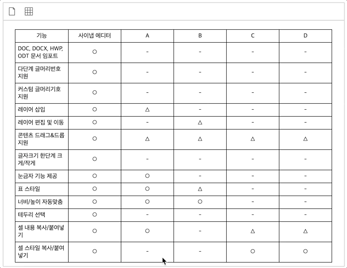 기능 사이냅 에디터 A B C D DOC, DOCX, HWP, ODT 문서 임포트 ○ - - - - 다단계 글머리번호 지원 ○ - - - - 커스텀 글머리기호 지원 ○ - - - - 레이어 삽입 ○ △ - - - 레이어 편집 및 이동 ○ - △ - - 콘텐츠 드래그&드롭 지원 ○ △ △ △ △ 글자크기 한단계 크게/작게 ○ - - - - 눈금자 기능 제공 ○ ○ - - - 표 스타일 ○ ○ △ - - 너비/높이 자동맞춤 ○ ○ ○ - - 테두리 선택 ○ - - - - 셀 내용 복사/붙여넣기 ○ ○ - △ △ 셀 스타일 복사/붙여넣기 ○ - - ○ ○