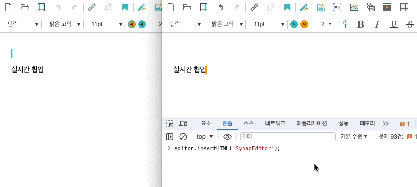 editor.insertHTML('SynapEditor');   // 변경된 내용이 다른 사용자들에게 동기화 되지 않음 (내 화면에서만 변경이 되어있는 상태)
