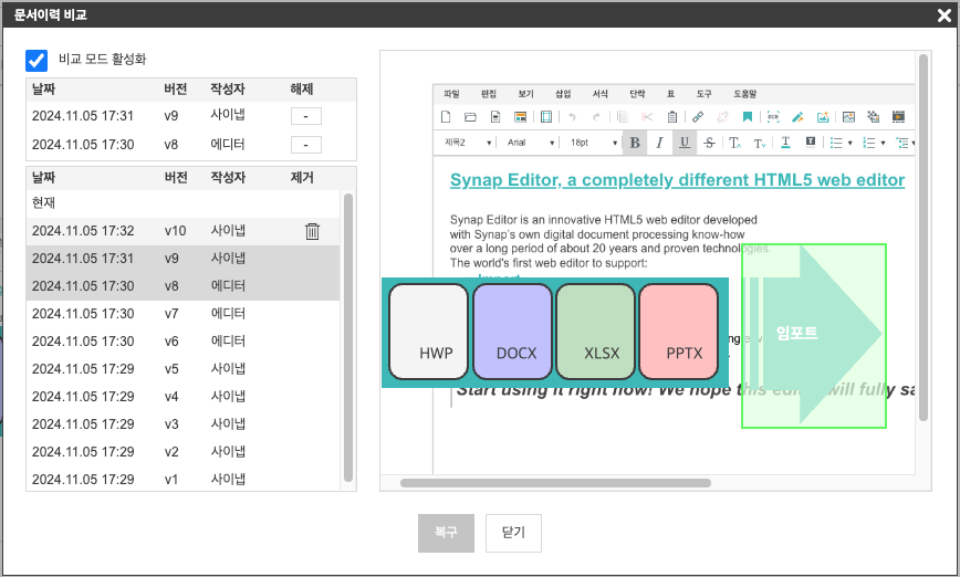- 비교 모드 활성화 시 버전별로 수정 및 추가, 삭제된 내용을 확인할 수 있습니다.