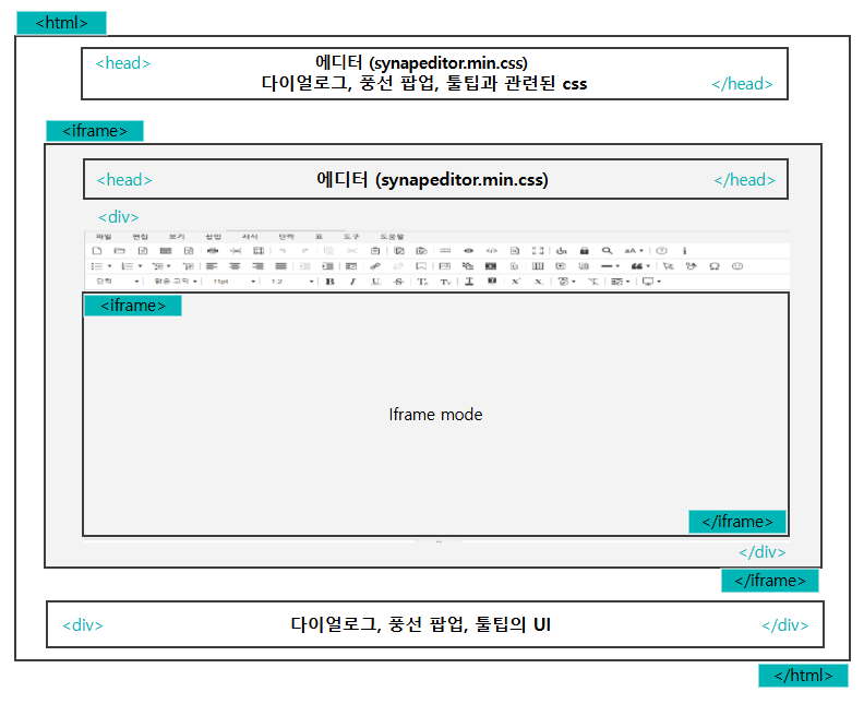 Iframe mode에디터가 <iframe> 안에 위치하며, 편집 영역이 <iframe>안쪽에 위치합니다.