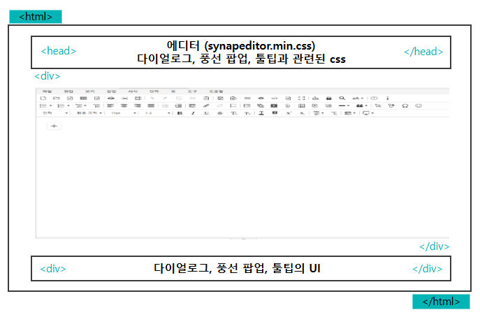 • 위의 그림과 같이 synapeditor.min.css는 최상위 haed에 설정해야 합니다.